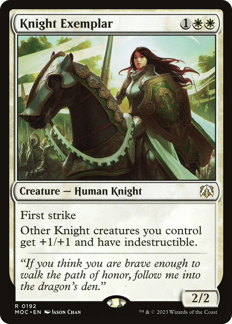 Other Knight creatures you control get +1/+1 and have indestructible. (Damage and effects that say “destroy” don’t destroy them.)