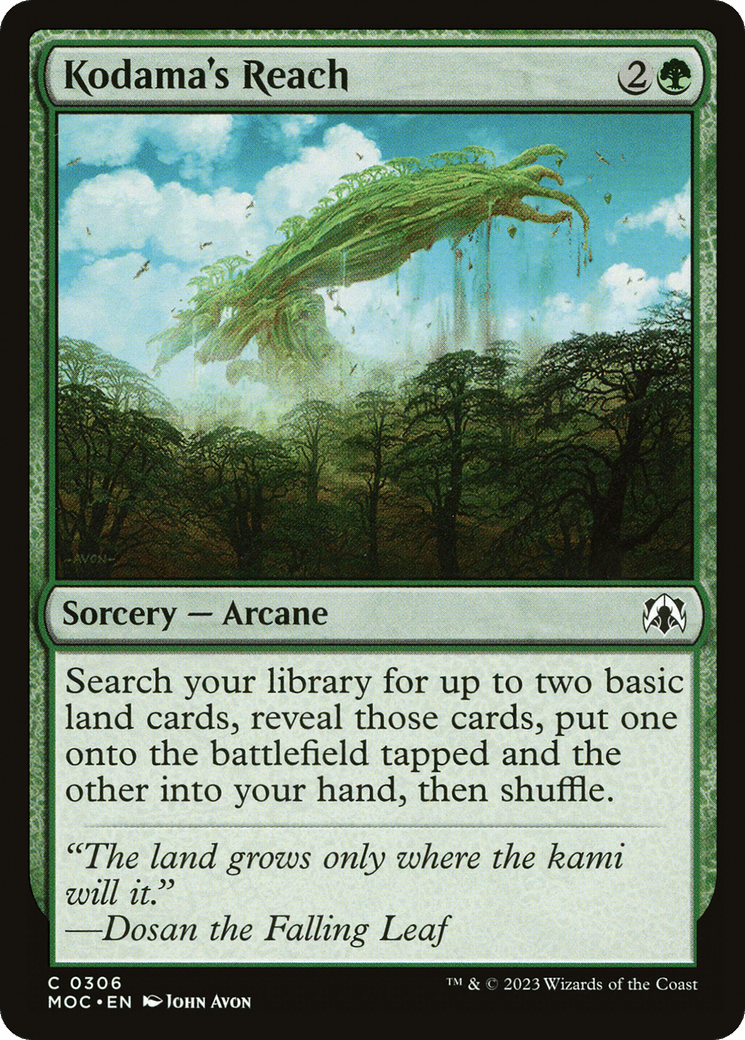 Search your library for up to two basic land cards, reveal those cards, put one onto the battlefield tapped and the other into your hand, then shuffle.
