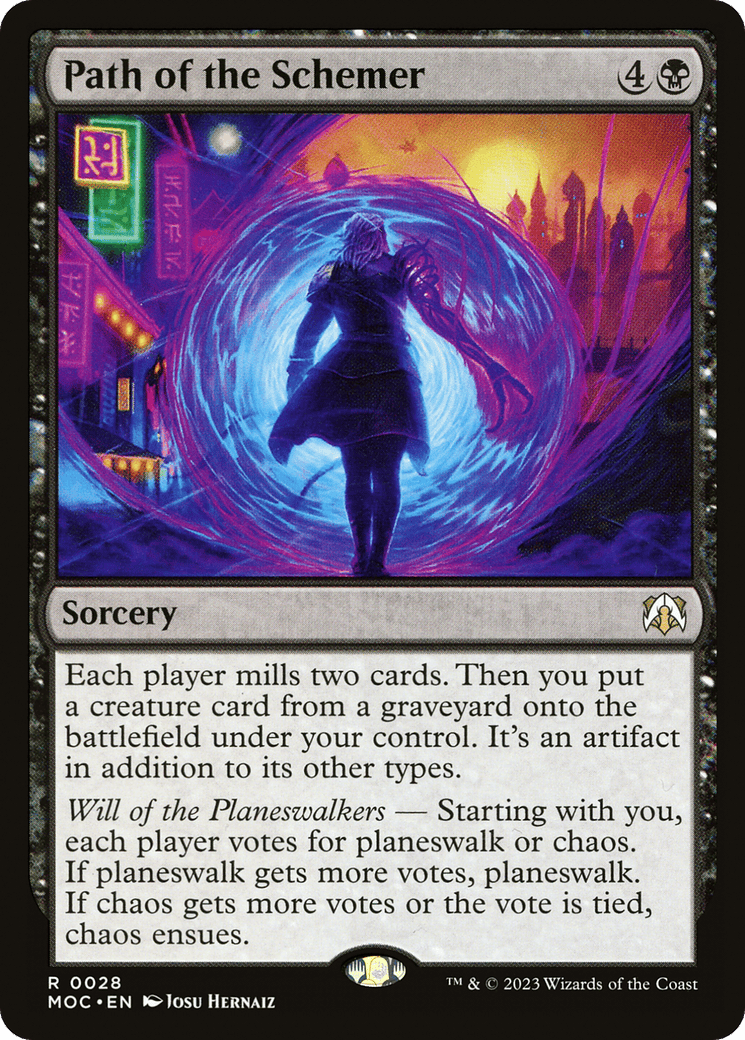 Each player mills two cards. Then you put a creature card from a graveyard onto the battlefield under your control. It’s an artifact in addition to its other types.