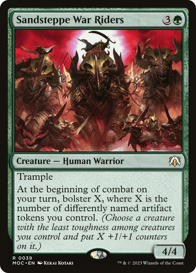 At the beginning of combat on your turn, bolster X, where X is the number of differently named artifact tokens you control. (Choose a creature with the least toughness among creatures you control and put X +1/+1 counters on it.)