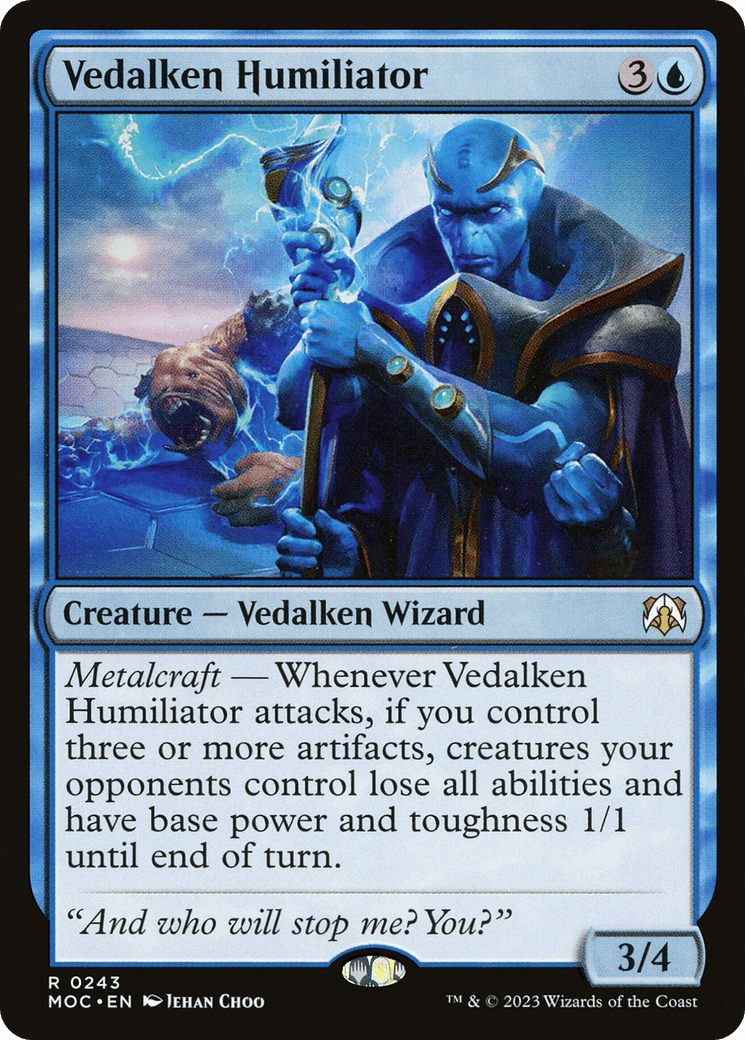 Metalcraft – Whenever this creature attacks, if you control three or more artifacts, creatures your opponents control lose all abilities and have base power and toughness 1/1 until end of turn.