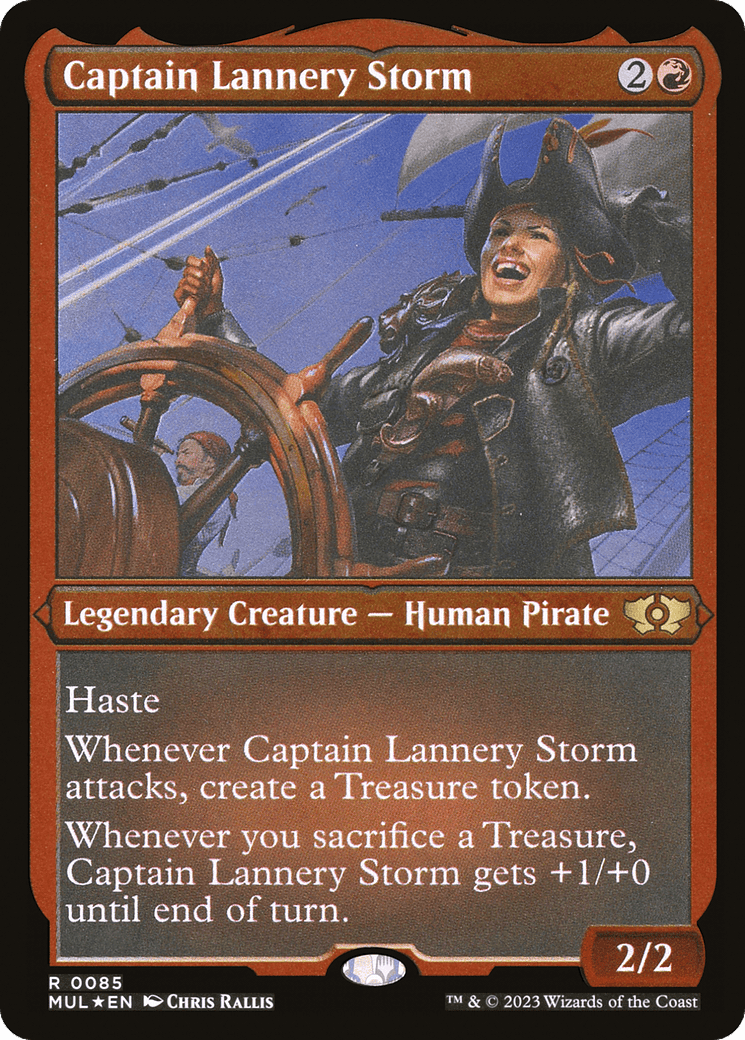 Whenever Captain Lannery Storm attacks, create a Treasure token. (It’s an artifact with “{T}, Sacrifice this token: Add one mana of any color.”)