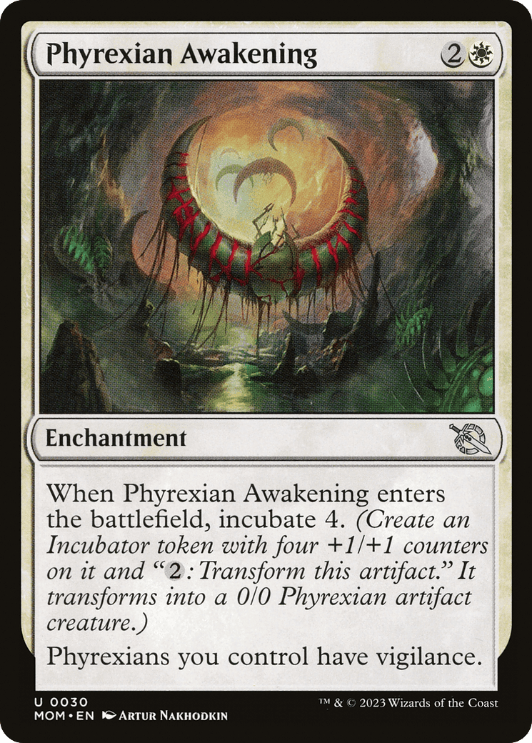 When this enchantment enters, incubate 4. (Create an Incubator token with four +1/+1 counters on it and “{2}: Transform this token.” It transforms into a 0/0 Phyrexian artifact creature.)