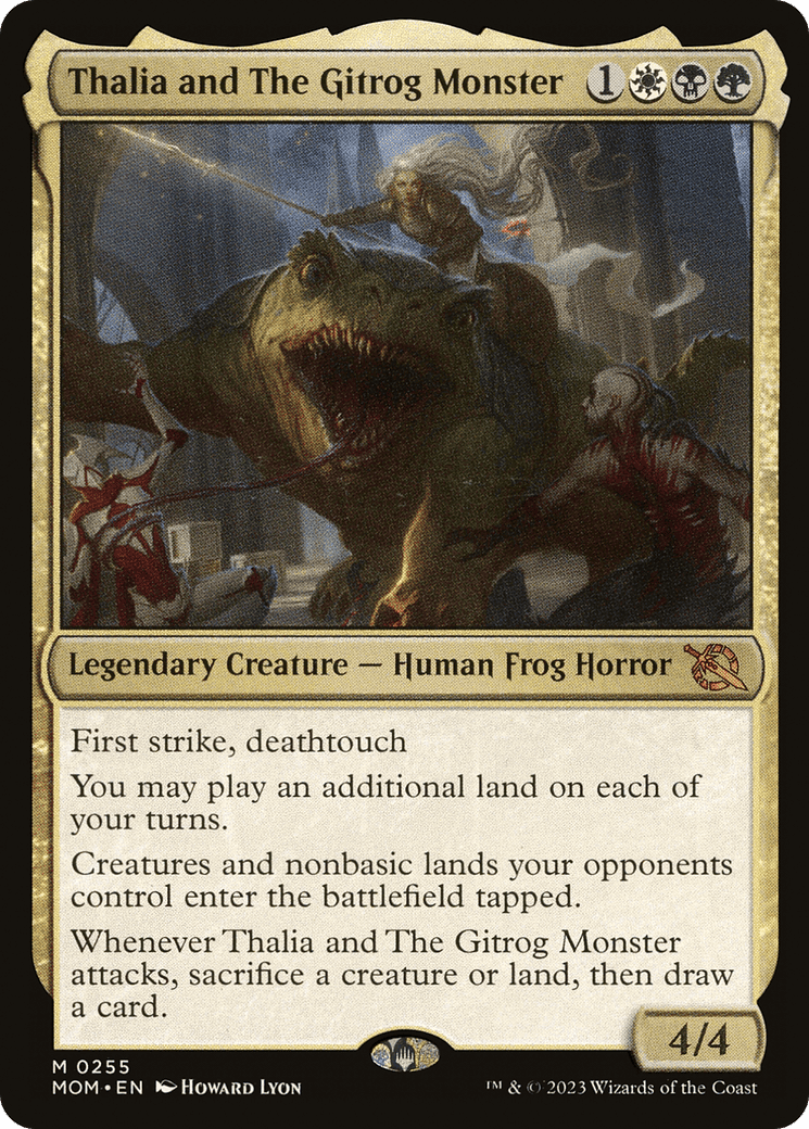 Whenever Thalia and The Gitrog Monster attacks, sacrifice a creature or land, then draw a card.