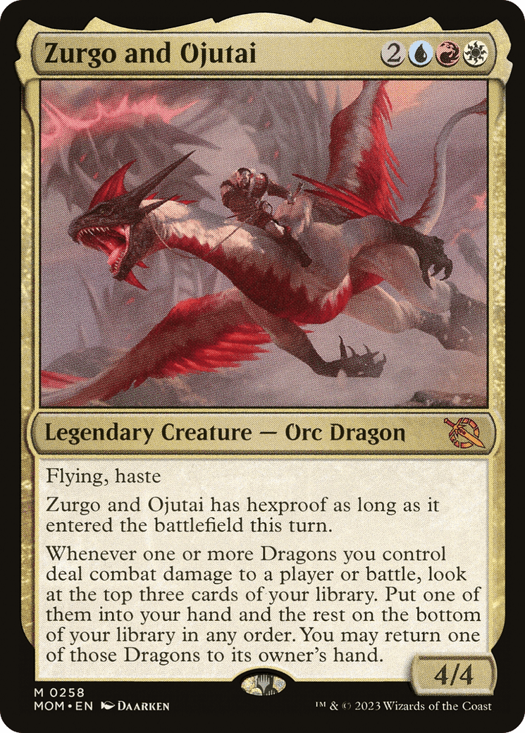 Whenever one or more Dragons you control deal combat damage to a player or battle, look at the top three cards of your library. Put one of them into your hand and the rest on the
