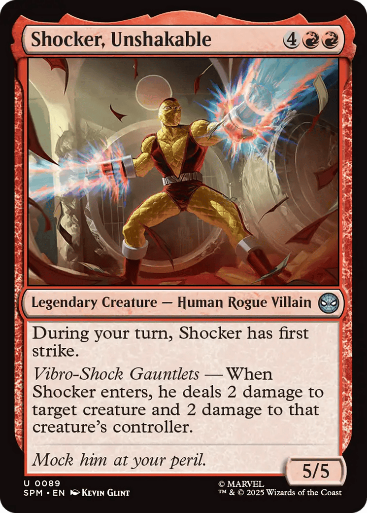 Vibro-Shock Gauntlets – When Shocker enters, he deals 2 damage to target creature and 2 damage to that creature’s controller.