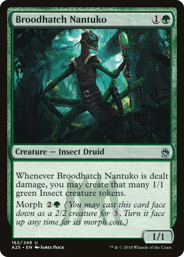 Whenever this creature is dealt damage, you may create that many 1/1 green Insect creature tokens.