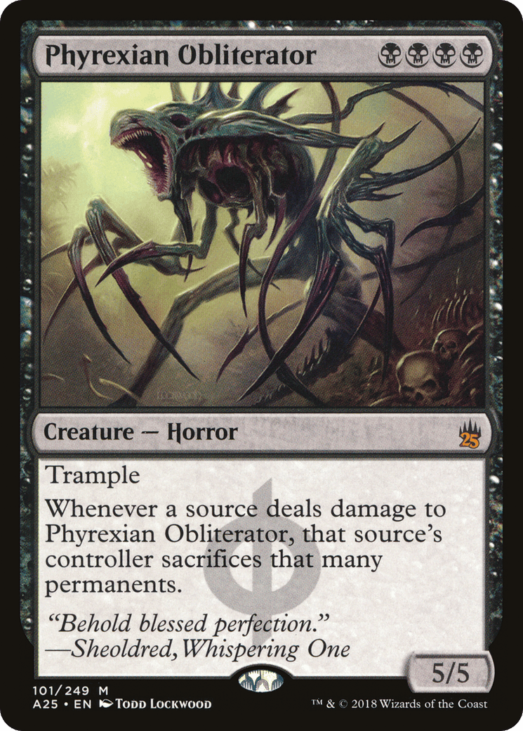 Whenever a source deals damage to this creature, that source’s controller sacrifices that many permanents of their choice.