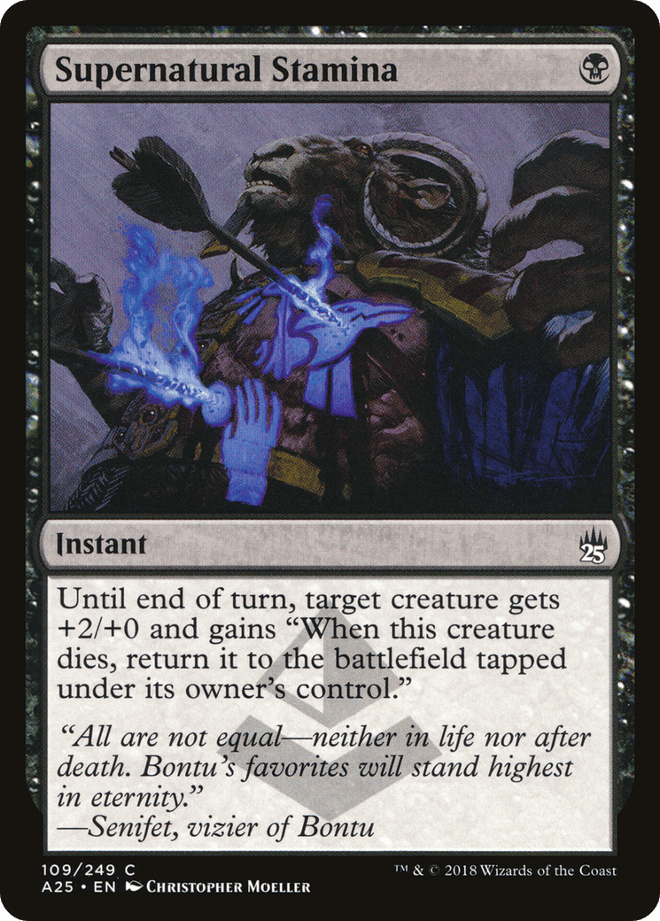 Until end of turn, target creature gets +2/+0 and gains “When this creature dies, return it to the battlefield tapped under its owner’s control.”
