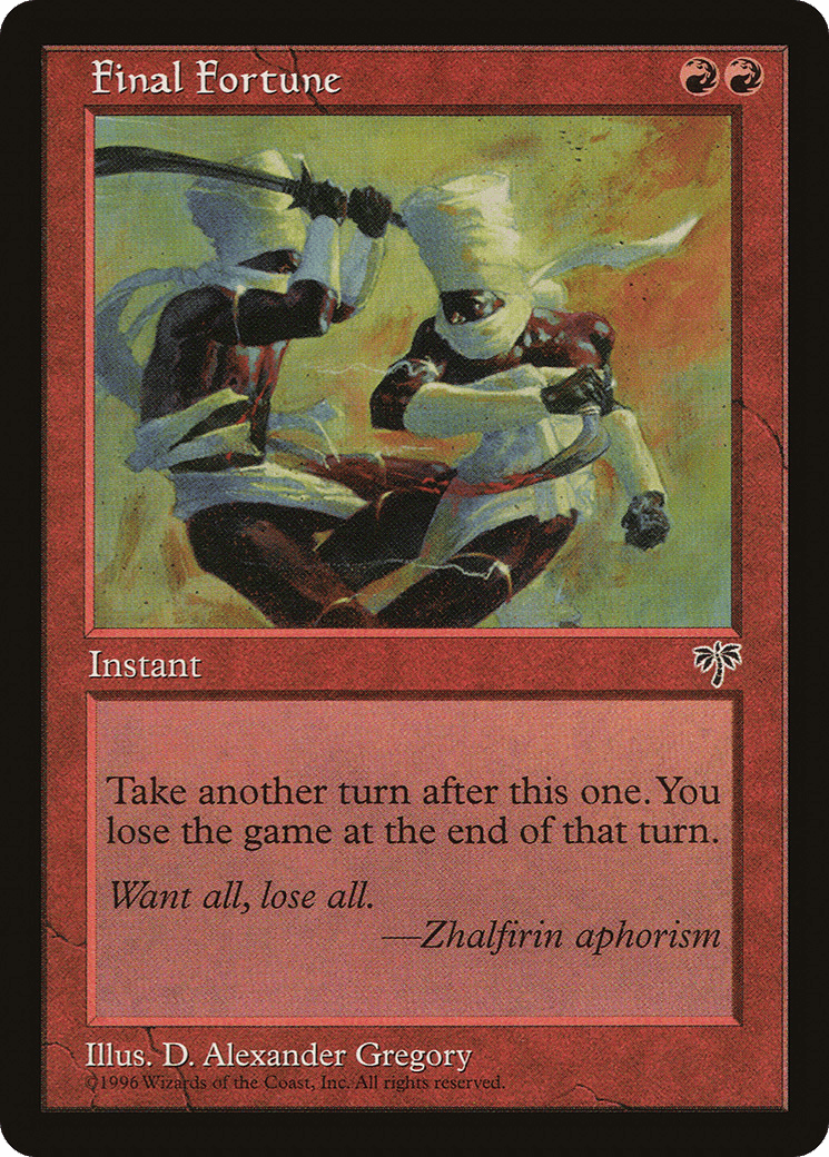 Take an extra turn after this one. At the beginning of that turn’s end step, you lose the game.