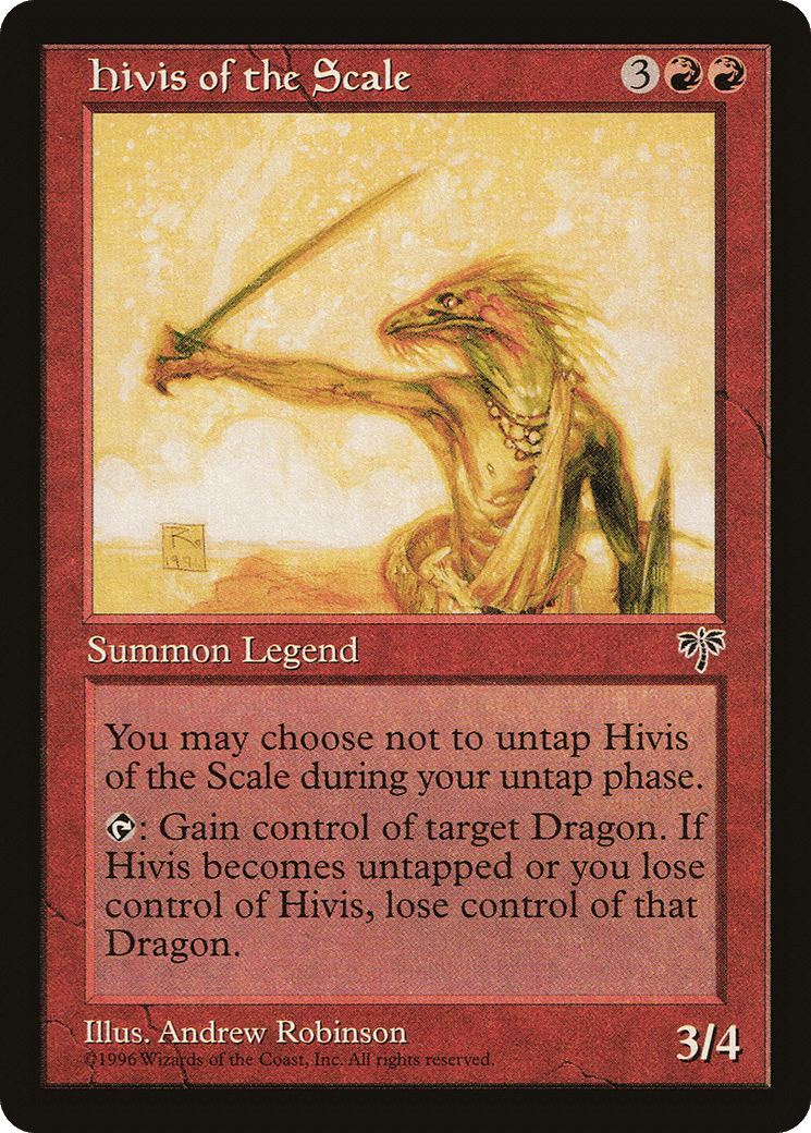 You may choose not to untap Hivis during your untap step. {T}: Gain control of target Dragon for as long as you control Hivis and Hivis remains tapped.