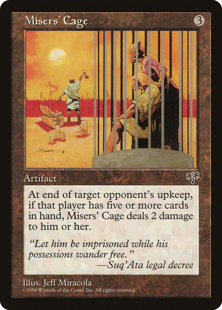 At the beginning of each opponent’s upkeep, if that player has five or more cards in hand, this artifact deals 2 damage to that player.