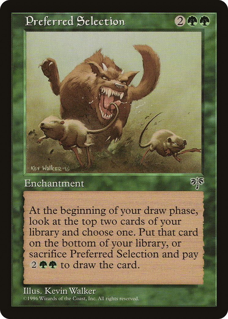 At the beginning of your upkeep, look at the top two cards of your library. You may sacrifice this enchantment and pay {2}{G}{G}. If you do, put one of those cards into your hand. If you don’t, put one of those cards on the bottom of your library.