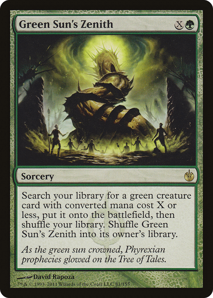 Search your library for a green creature card with mana value X or less, put it onto the battlefield, then shuffle. Shuffle Green Sun’s Zenith into its owner’s library.