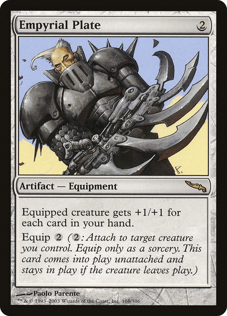 Equipped creature gets +1/+1 for each card in your hand. Equip {2}