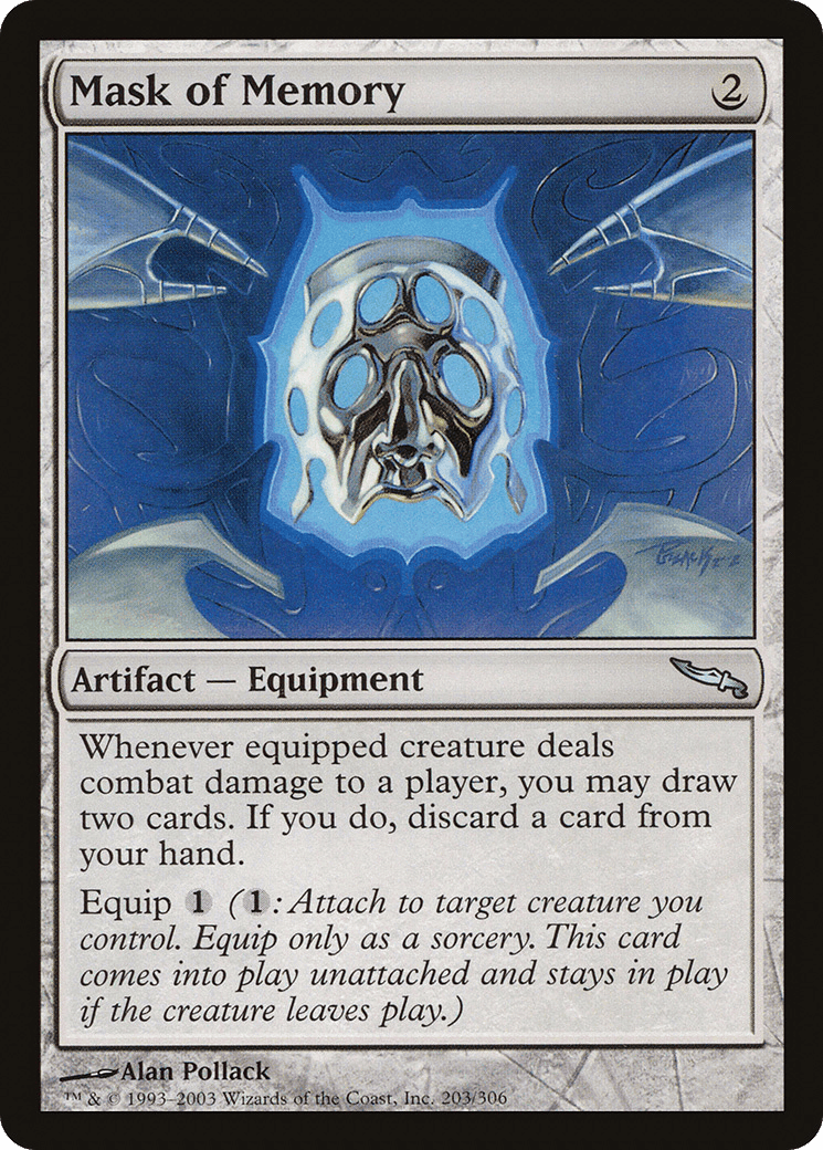 Whenever equipped creature deals combat damage to a player, you may draw two cards. If you do, discard a card.