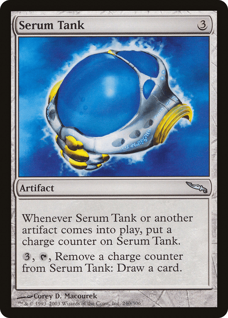 Whenever this artifact or another artifact enters, put a charge counter on this artifact. {3}, {T}, Remove a charge counter from this artifact: Draw a card.