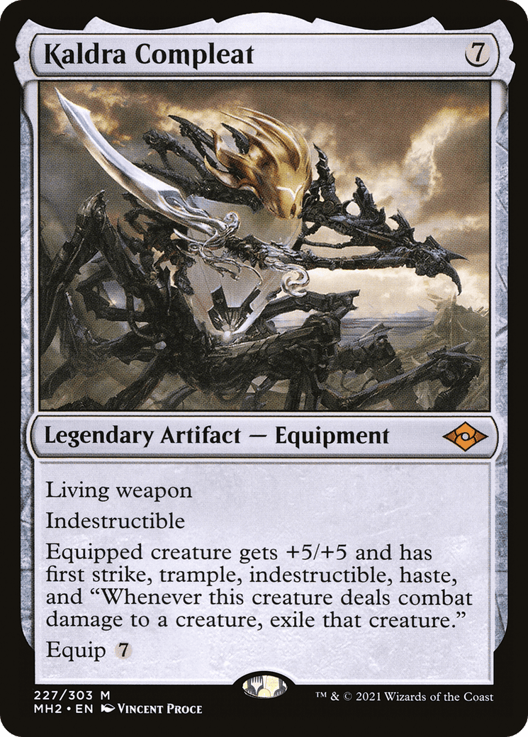 Equipped creature gets +5/+5 and has first strike, trample, indestructible, haste, and “Whenever this creature deals combat damage to a creature, exile that creature.”