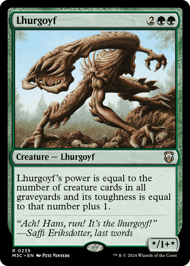 Lhurgoyf’s power is equal to the number of creature cards in all graveyards and its toughness is equal to that number plus 1.