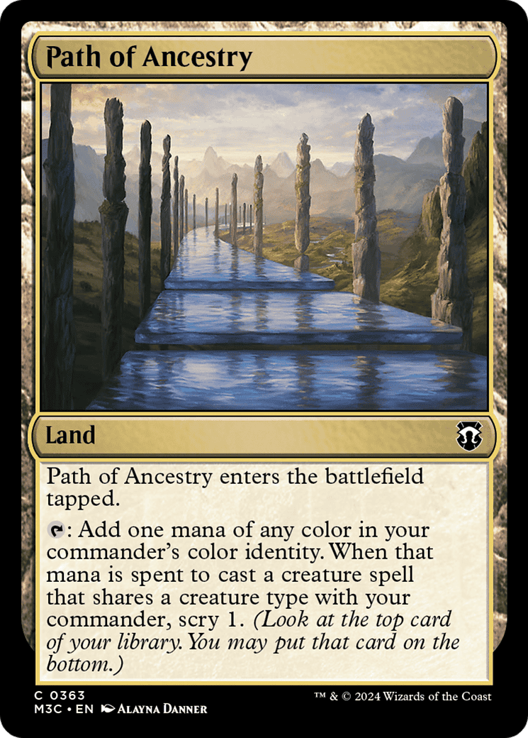 {T}: Add one mana of any color in your commander’s color identity. When that mana is spent to cast a creature spell that shares a creature type with your commander, scry 1. (Look at the top card of your library. You may put that c