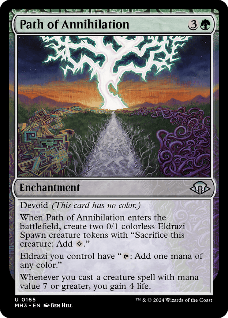 When this enchantment enters, create two 0/1 colorless Eldrazi Spawn creature tokens with “Sacrifice this token: Add {C}.”