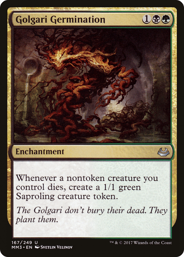 Whenever a nontoken creature you control dies, create a 1/1 green Saproling creature token.