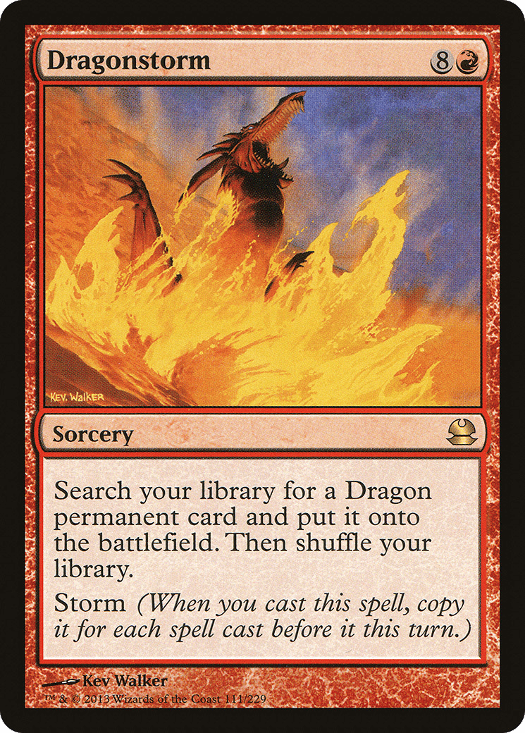 Search your library for a Dragon permanent card, put it onto the battlefield, then shuffle. Storm (When you cast this spell, copy it for each spell cast before it this turn.)
