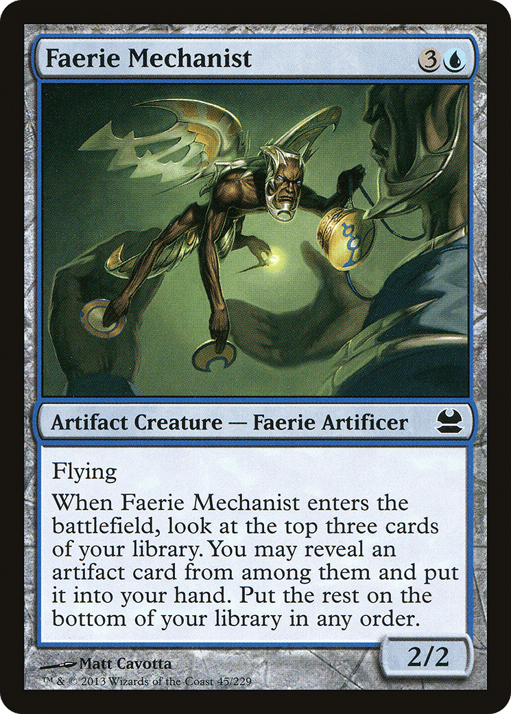 When this creature enters, look at the top three cards of your library. You may reveal an artifact card from among them and put it into your hand. Put the rest on the bottom of your library in any order.