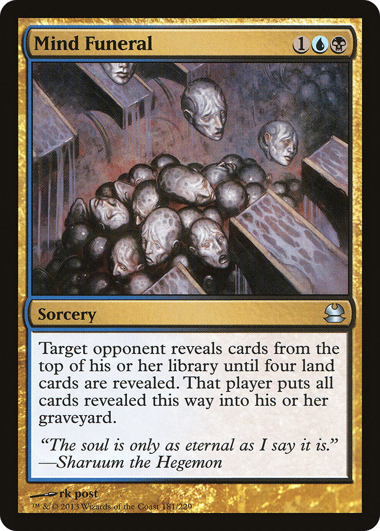 Target opponent reveals cards from the top of their library until four land cards are revealed. That player puts all cards revealed this way into their graveyard.