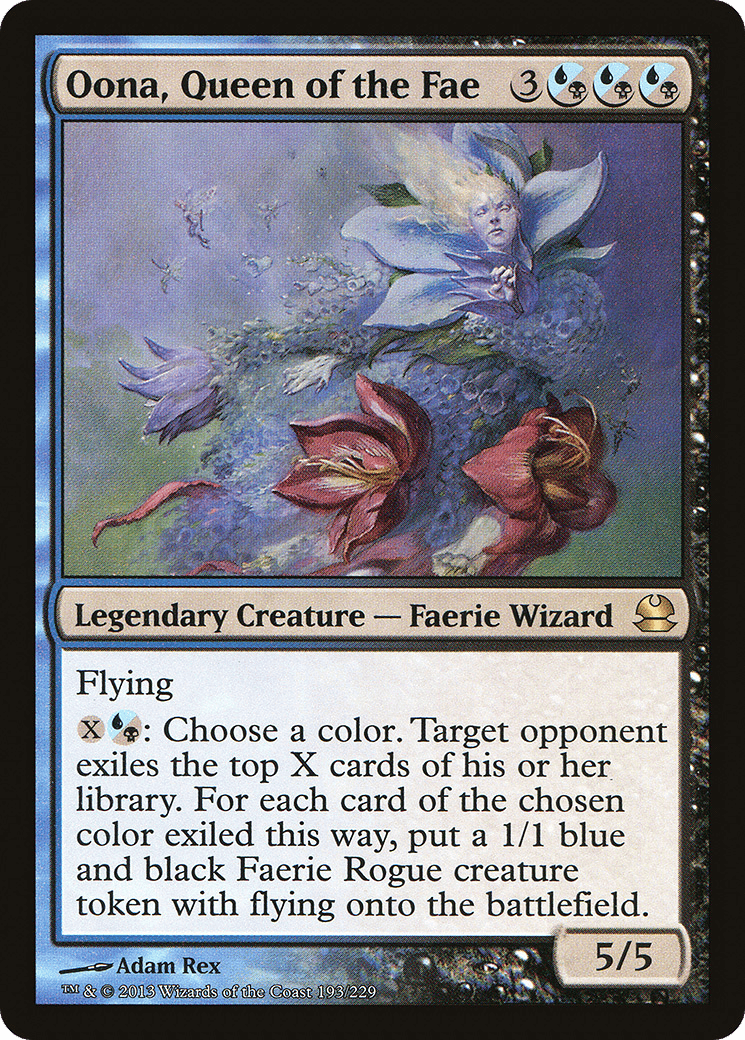 {X}{U/B}: Choose a color. Target opponent exiles the top X cards of their library. For each card of the chosen color exiled this way, create a 1/1 blue and black Faerie Rogue creature token with flying.