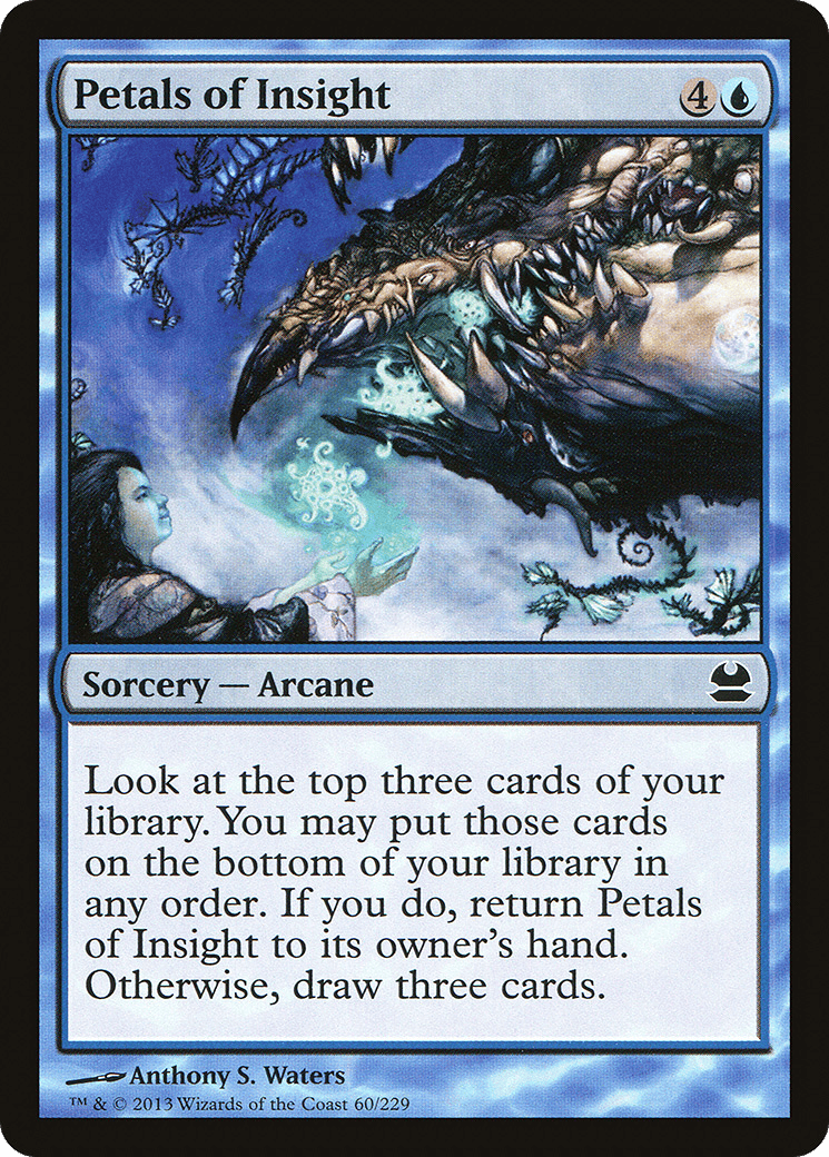 Look at the top three cards of your library. You may put those cards on the bottom of your library in any order. If you do, return Petals of Insight to its owner’s hand. Otherwise, draw three cards.