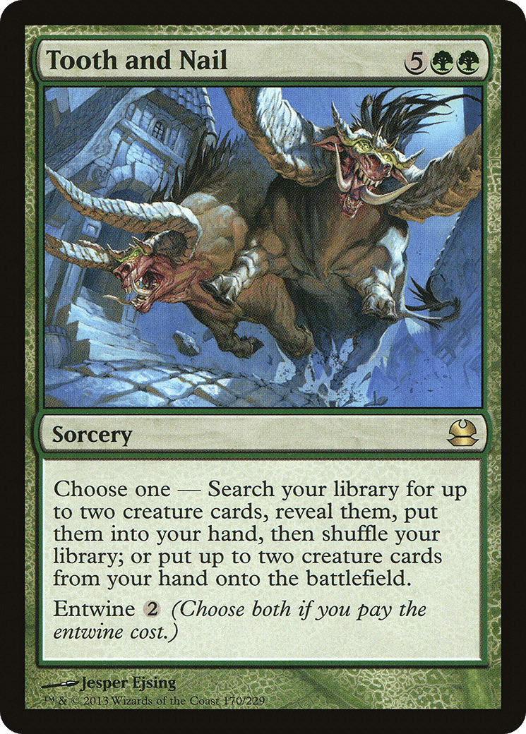 – Search your library for up to two creature cards, reveal them, put them into your hand, then shuffle.