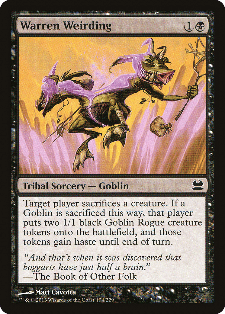 Target player sacrifices a creature of their choice. If a Goblin is sacrificed this way, that player creates two 1/1 black Goblin Rogue creature tokens, and those tokens gain haste until end of turn.