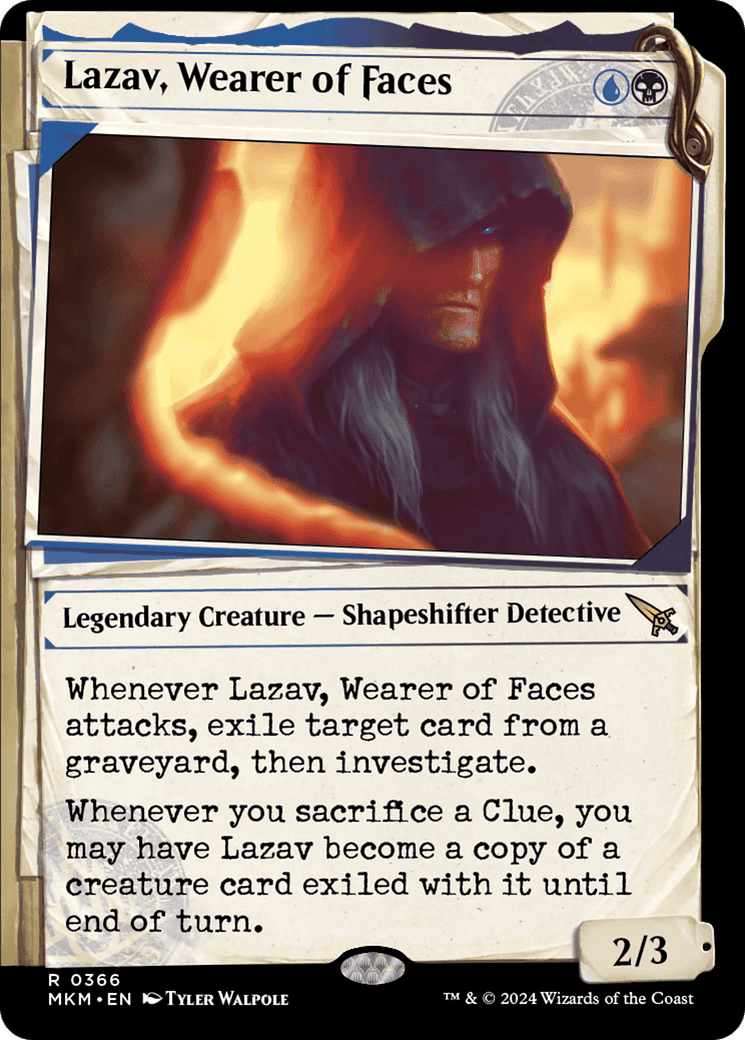 Whenever Lazav attacks, exile target card from a graveyard, then investigate. (Create a Clue token. It’s an artifact with “{2}, Sacrifice this token: Draw a card.”)