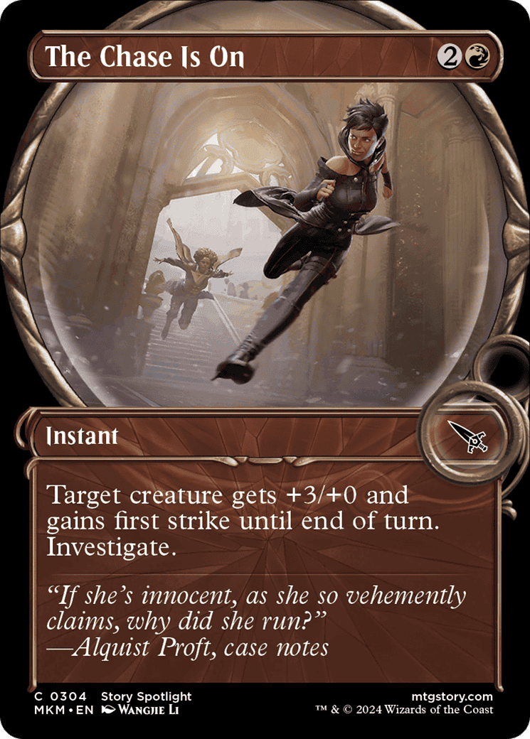 Target creature gets +3/+0 and gains first strike until end of turn. Investigate. (Create a Clue token. It’s an artifact with “{2}, Sacrifice this token: Draw a card.”)