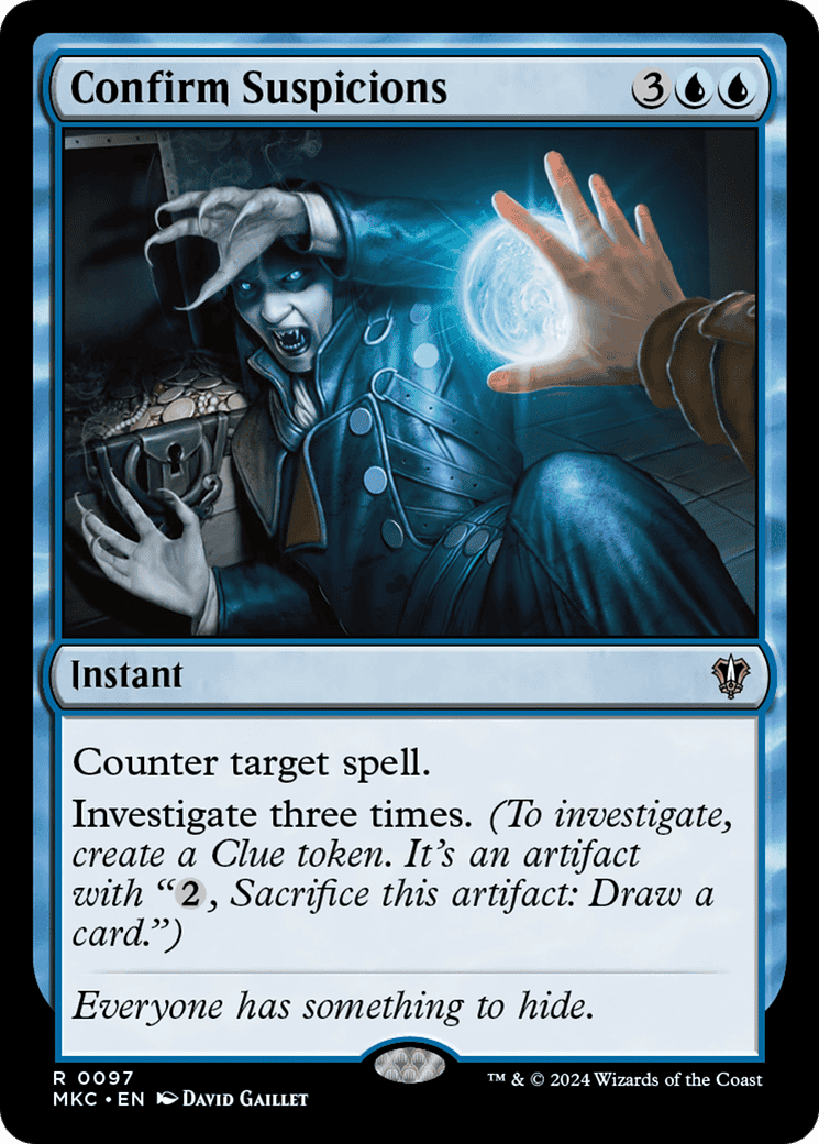 Investigate three times. (To investigate, create a Clue token. It’s an artifact with “{2}, Sacrifice this token: Draw a card.”)