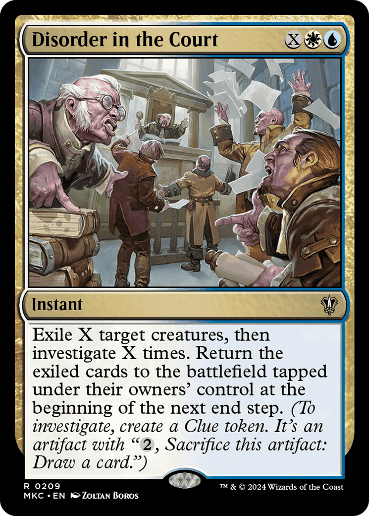 Exile X target creatures, then investigate X times. Return the exiled cards to the battlefield tapped under their owners’ control at the beginning of the next end step. (To investigate, create a Clue token. It’s an artifact with “{2}, Sacrifice this token