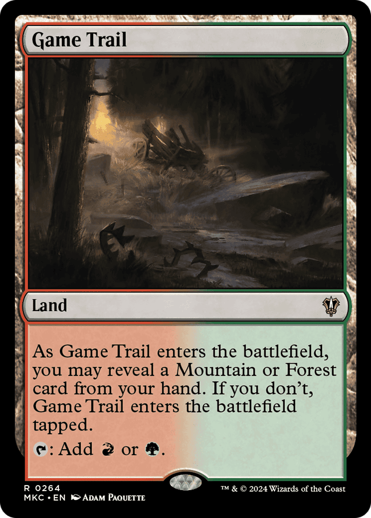 As this land enters, you may reveal a Mountain or Forest card from your hand. If you don’t, this land enters tapped. {T}: Add {R} or {G}.