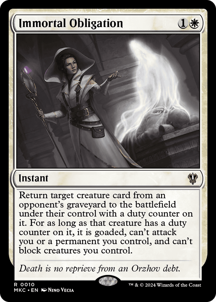 Return target creature card from an opponent’s graveyard to the battlefield under their control with a duty counter on it. For as long as that creature has a duty counter on it, it is goaded, can’t attack you or a permanent you control, and can’t block cr