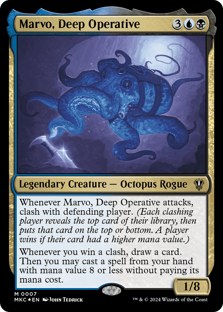 Whenever Marvo attacks, clash with defending player. (Each clashing player reveals the top card of their library, then puts that card on their choice of the top or bottom. A player wins if their card had a greater mana value.)