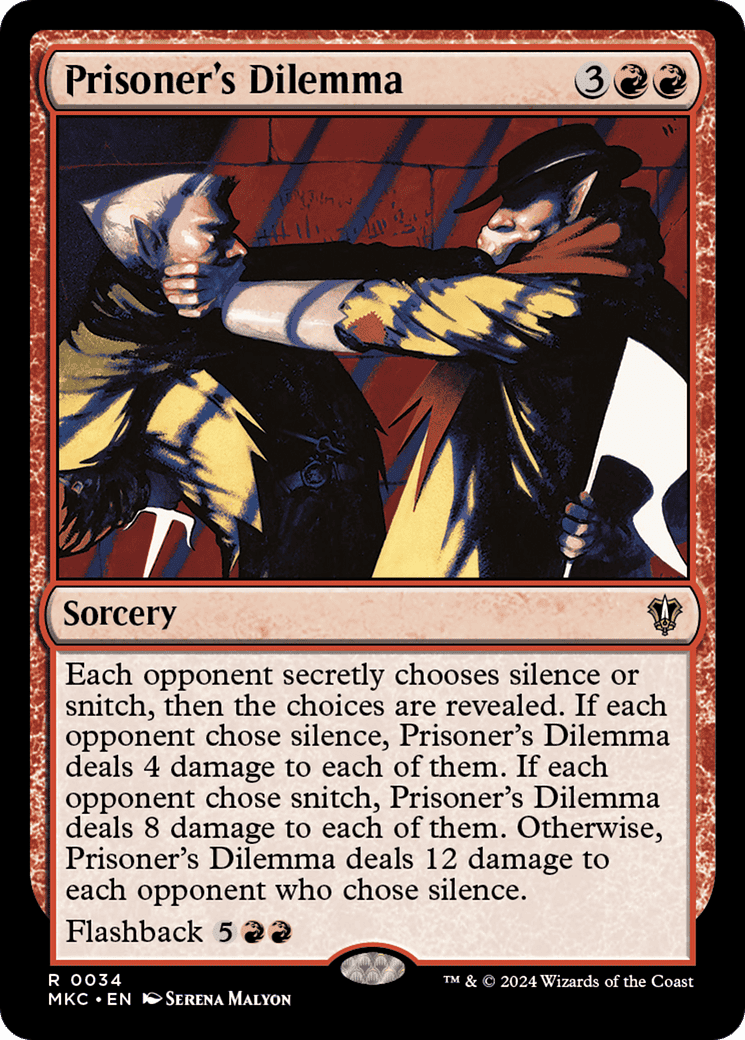 Each opponent secretly chooses silence or snitch, then the choices are revealed. If each opponent chose silence, Prisoner’s Dilemma deals 4 damage to each of them. If each opponent chose snitch, Prisoner’s Dilemma deals 8 damage to each of them. Otherwise