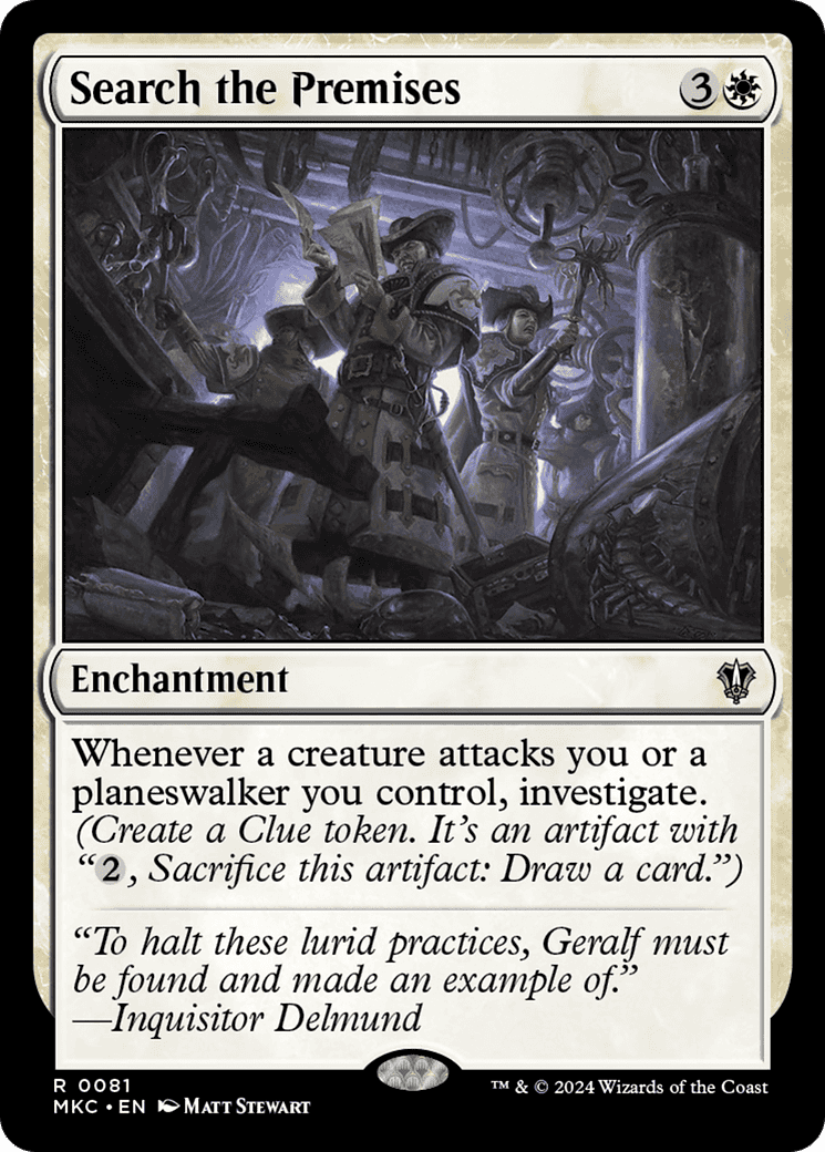 Whenever a creature attacks you or a planeswalker you control, investigate. (Create a Clue token. It’s an artifact with “{2}, Sacrifice this token: Draw a card.”)