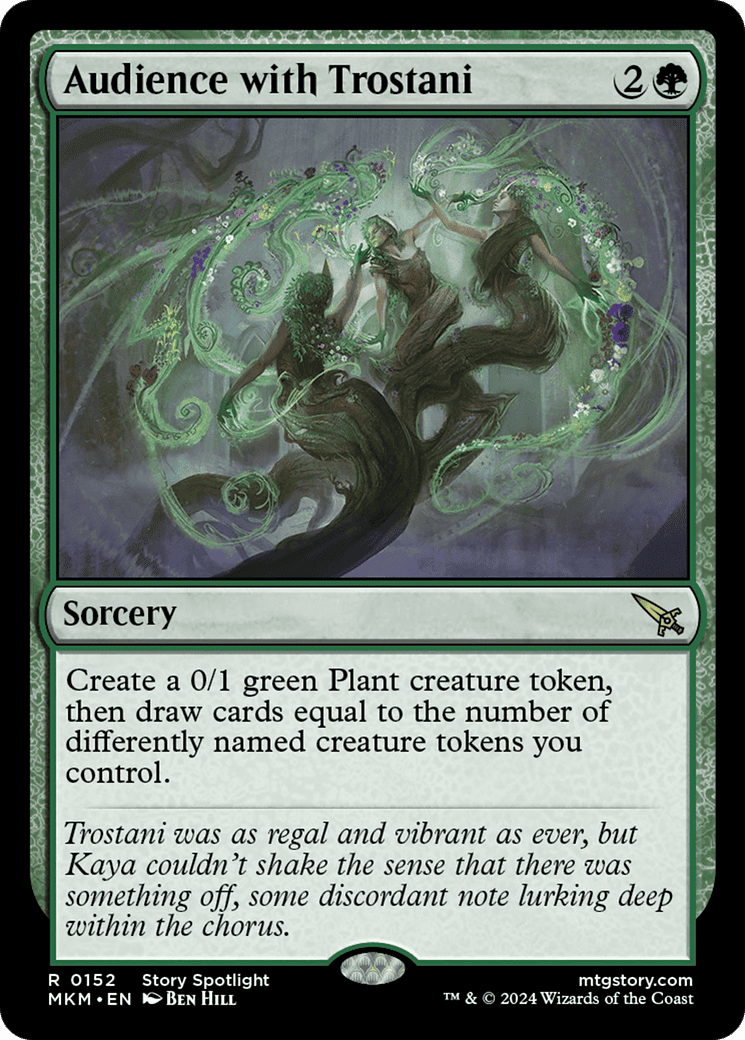 Create a 0/1 green Plant creature token, then draw cards equal to the number of differently named creature tokens you control.