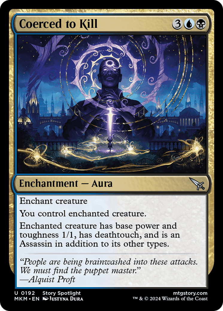 Enchanted creature has base power and toughness 1/1, has deathtouch, and is an Assassin in addition to its other types.