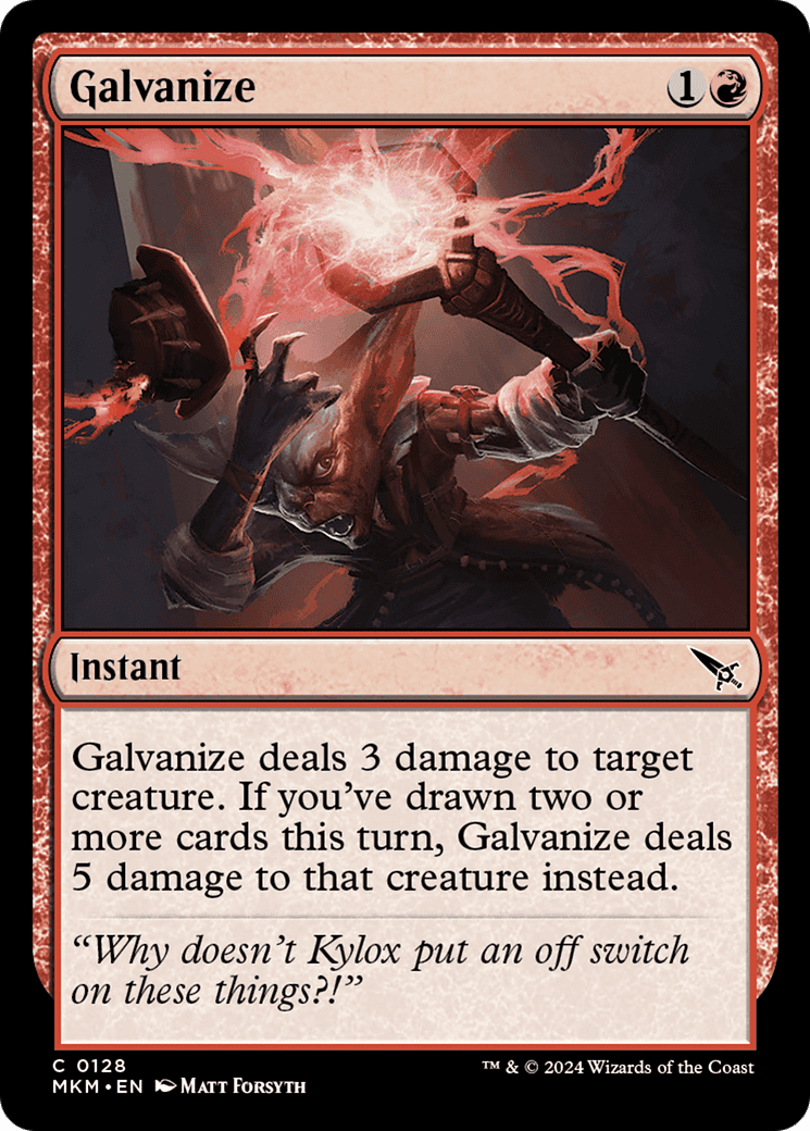 Galvanize deals 3 damage to target creature. If you’ve drawn two or more cards this turn, Galvanize deals 5 damage to that creature instead.