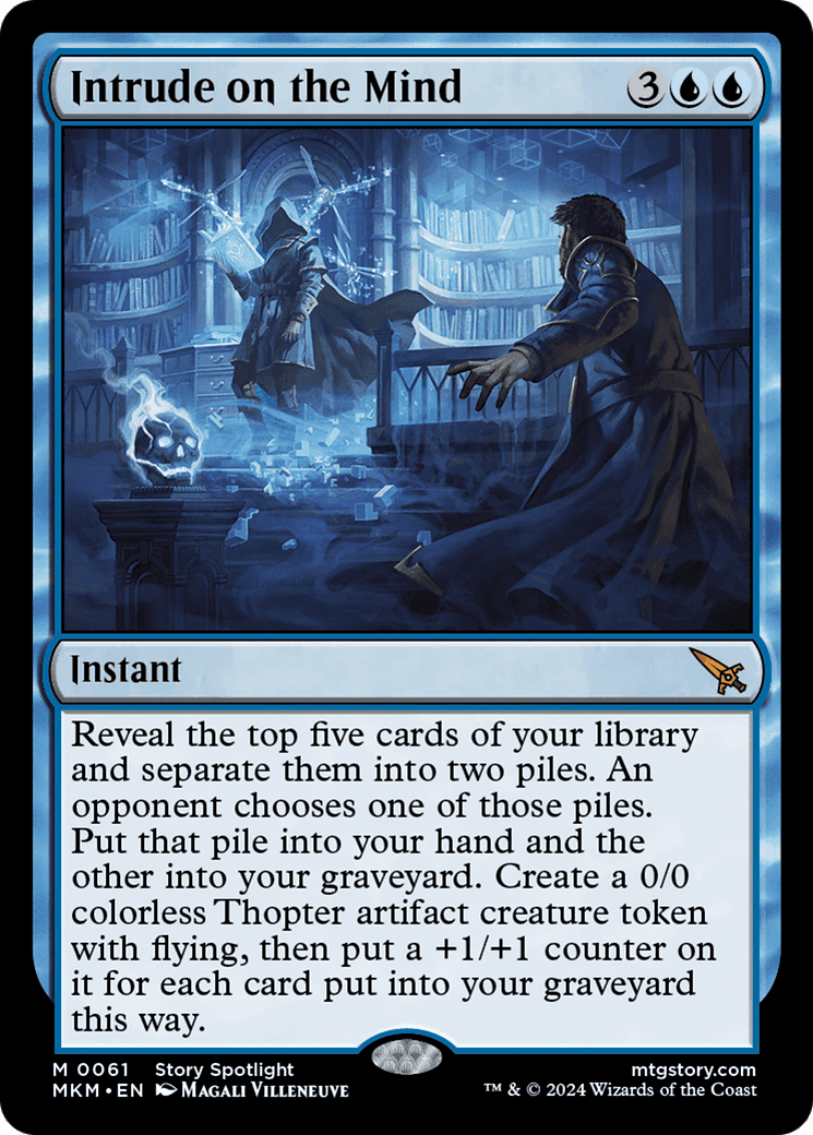 Reveal the top five cards of your library and separate them into two piles. An opponent chooses one of those piles. Put that pile into your hand and the other into your graveyard. Create a 0/0 colorless Thopter artifact creature token with flying, then pu