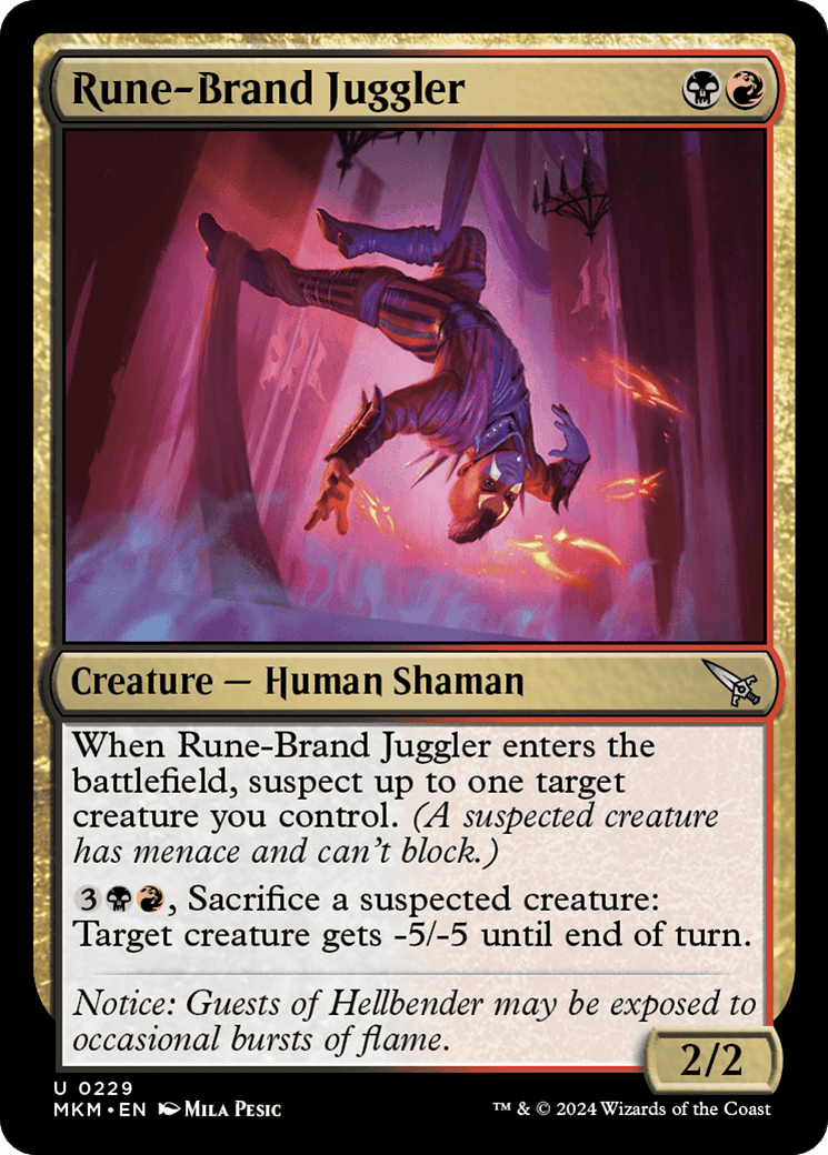 When this creature enters, suspect up to one target creature you control. (A suspected creature has menace and can’t block.)