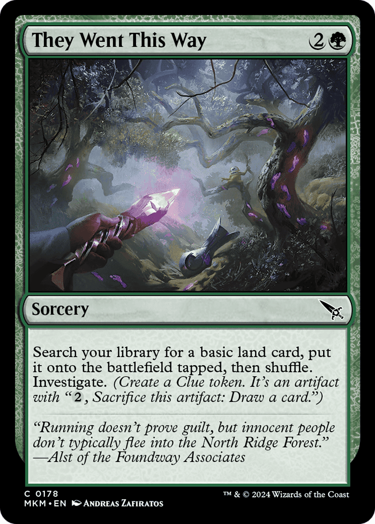 Search your library for a basic land card, put it onto the battlefield tapped, then shuffle. Investigate. (Create a Clue token. It’s an artifact with “{2}, Sacrifice this token: Draw a card.”)
