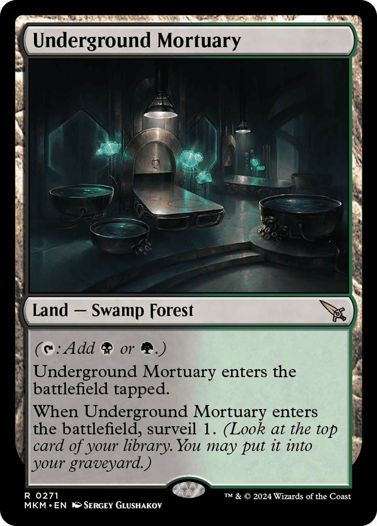 ({T}: Add {B} or {G}.) This land enters tapped. When this land enters, surveil 1. (Look at the top card of your library. You may put it into your graveyard.)