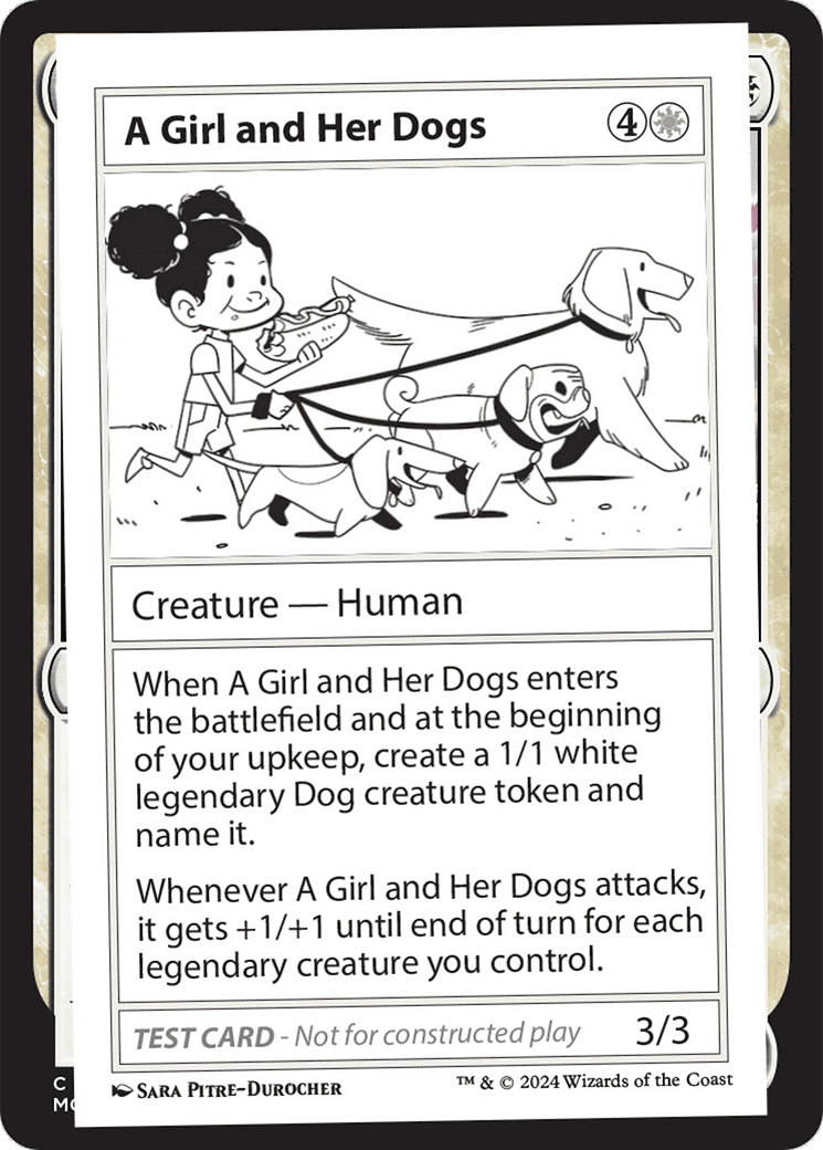 When A Girl and Her Dogs enters the battlefield and at the beginning of your upkeep, create a 1/1 white legendary Dog creature token and name it.